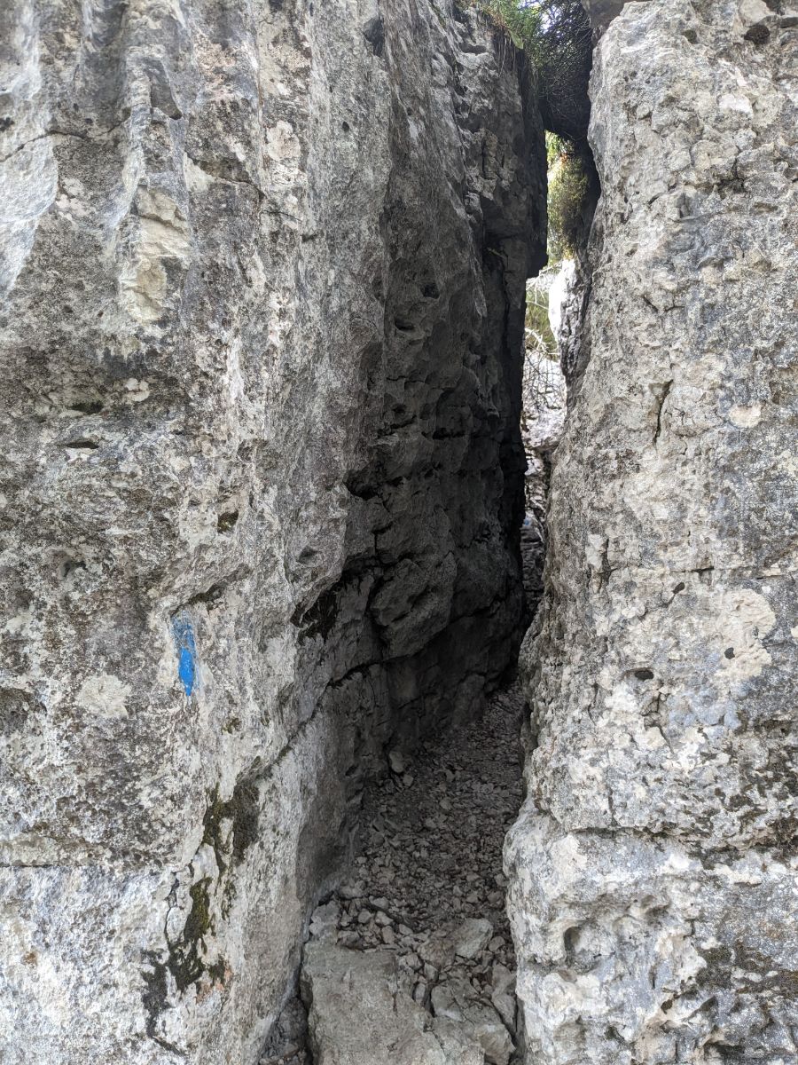 Altri due o tre bolli, e siamo in una specie di androne protetto da roccia ed albero. A guardare bene, un bollo punta a una strettissima spaccatura nella roccia: è l’ingresso al Labirinto della Brustolà!