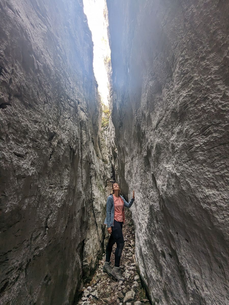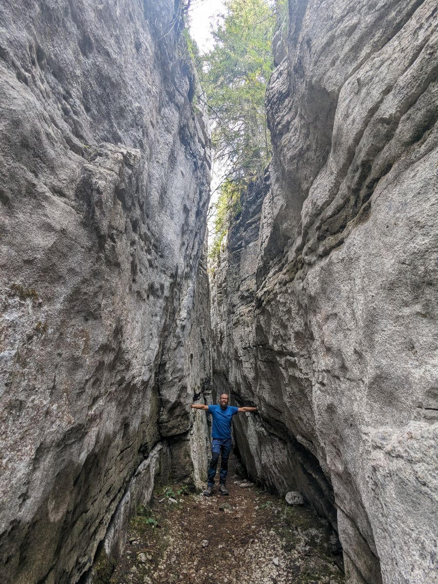 Seguendo i bolli blu si percorre un vero e proprio labirinto, tra fessure e altissimi corridoi, trincee – la zona è stata in parte rimaneggiata per motivi bellici – e valli interne, camere protette dalla vegetazione e scivoli naturali. Si tratta di un percorso molto simile ai Castelloni di San Marco, ma più appartato e senza punti veramente panoramici. In ogni caso: stupefancente, bellissima natura dell’Altopiano di Asiago!