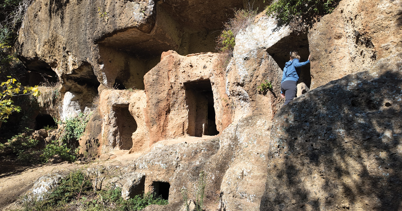 Ancora un po’ di morbidi saliscendi rurali e siamo all’ingresso del Parco del Marturanum dove, se sei un appassionato di storia preromana, avrai di che divertirti (e se non lo sei preparati lo stesso, perché lo stupore sarà davvero tanto). Qui una serie di sentieri si snodano in un fitto bosco, portandoti al cospetto di una pletora di tombe etrusche dalle forme più diverse: seminascoste o monumentali, isolate o a due piani, da guardare o da esplorare… è una meraviglia: il Cammino dei 3 Villaggi qui si gioca la sua carta più potente così, a pochi chilometri dalla partenza, e ti convince fin da subito che sarà un itinerario davvero bello.