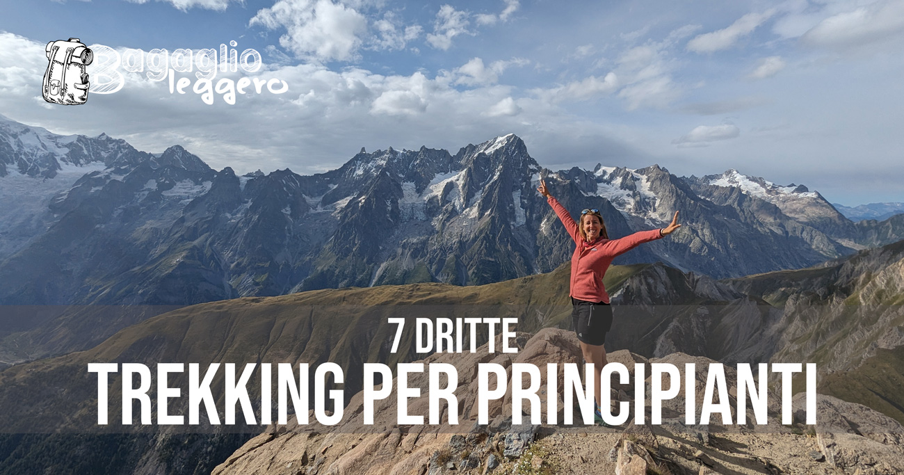 Aggiungi bastoncini telescopici (per me essenziali per imparare a camminare in salita con una buona postura), borraccia, cappello e occhiali da sole (il riverbero in montagna è tremendo).