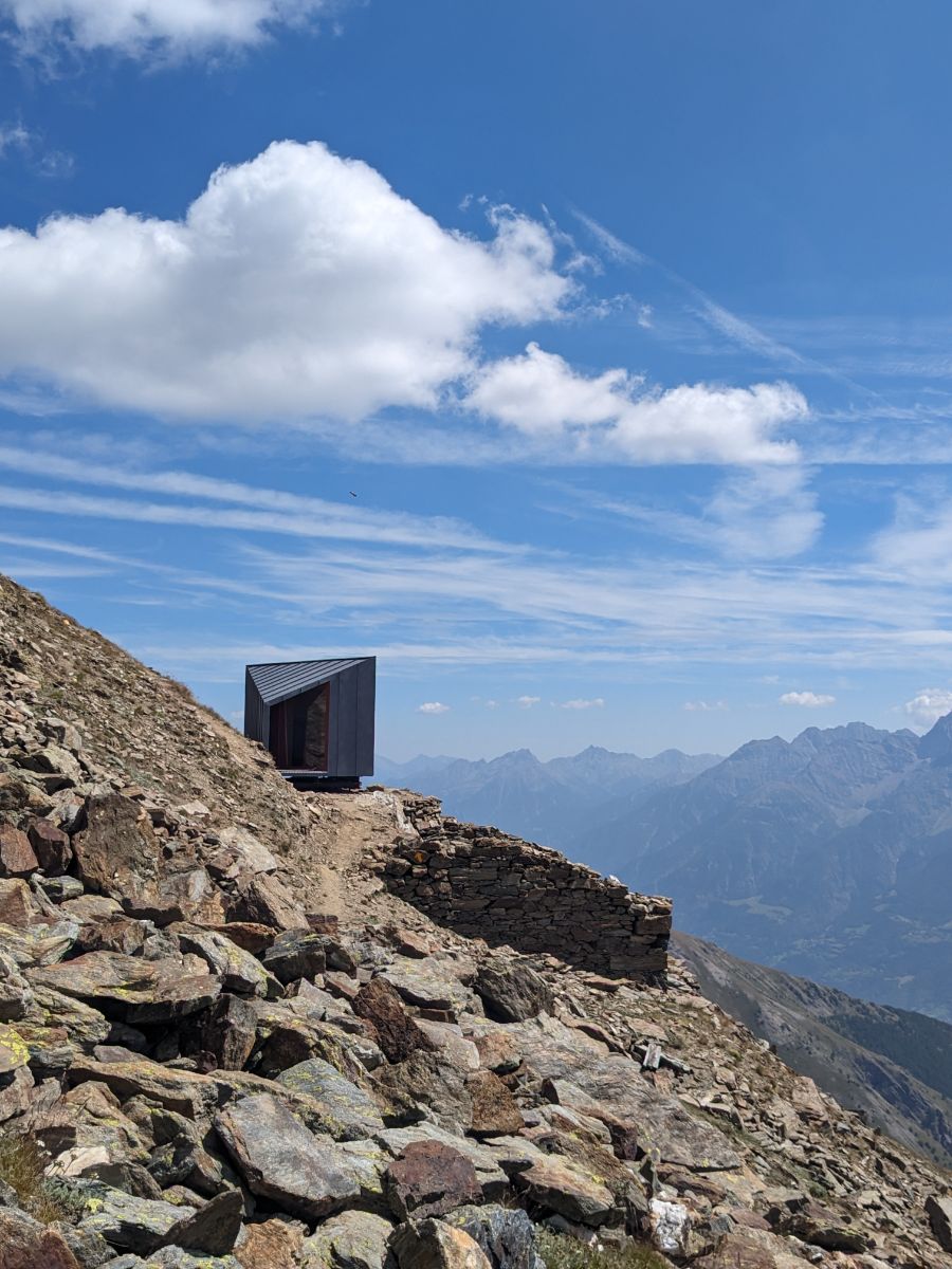 Ad un certo punto, osserviamo sulla destra, in alto, una sagomina rossa e grigia: è il Bivacco Alessandro Pansa. Attorno ai 2980 metri di quota, in piena pietraia, imbocchiamo il sentiero che ci porta lì.