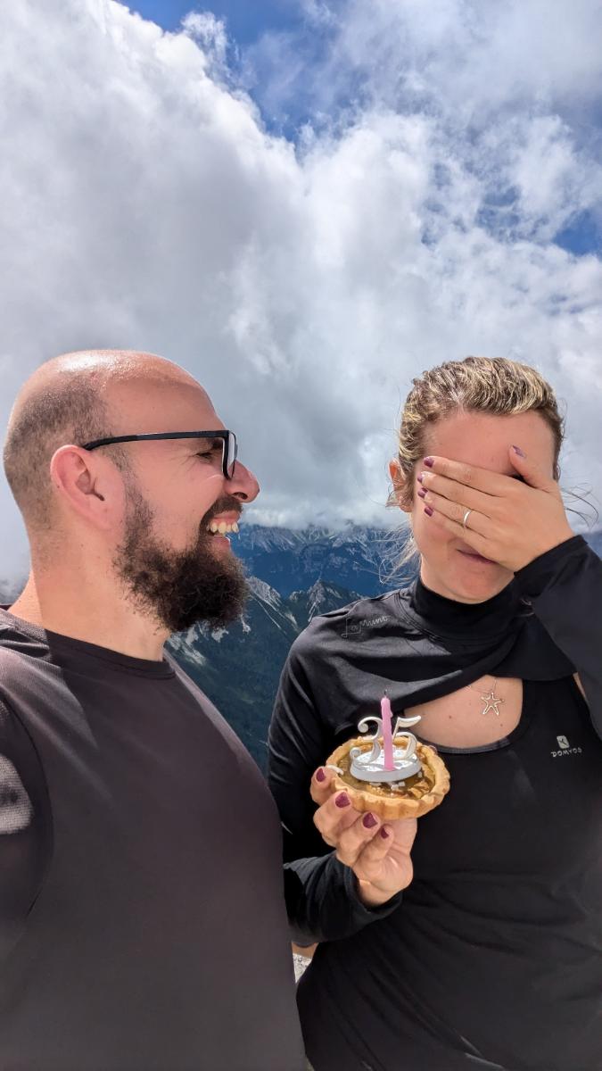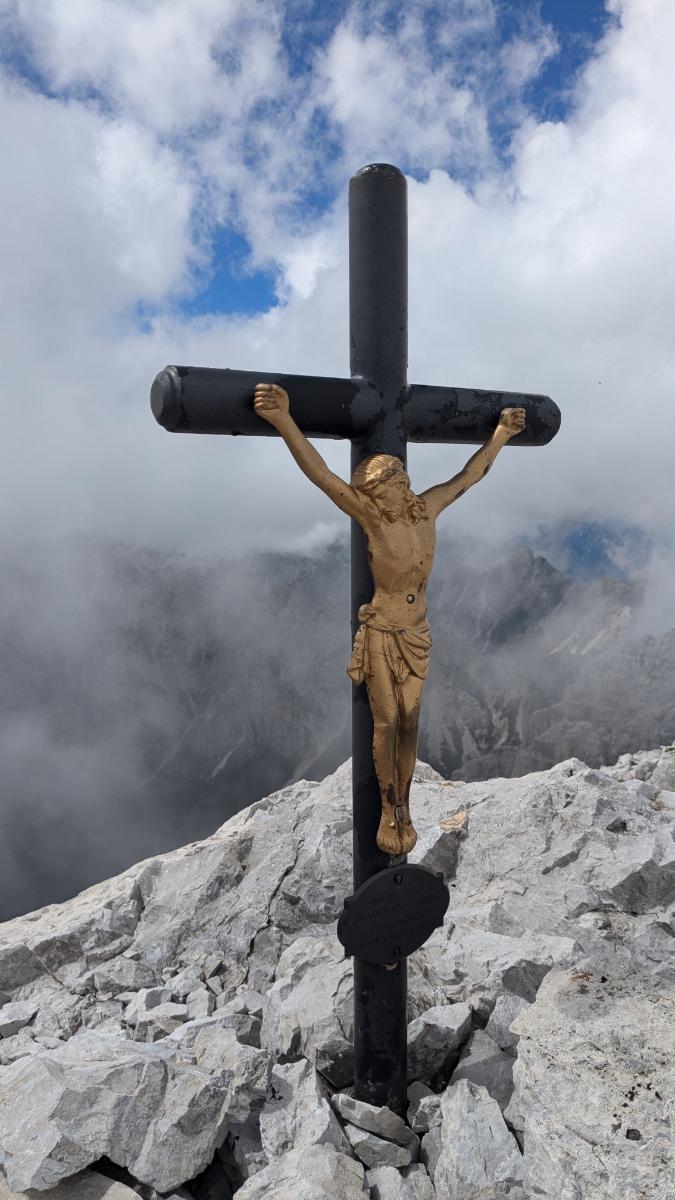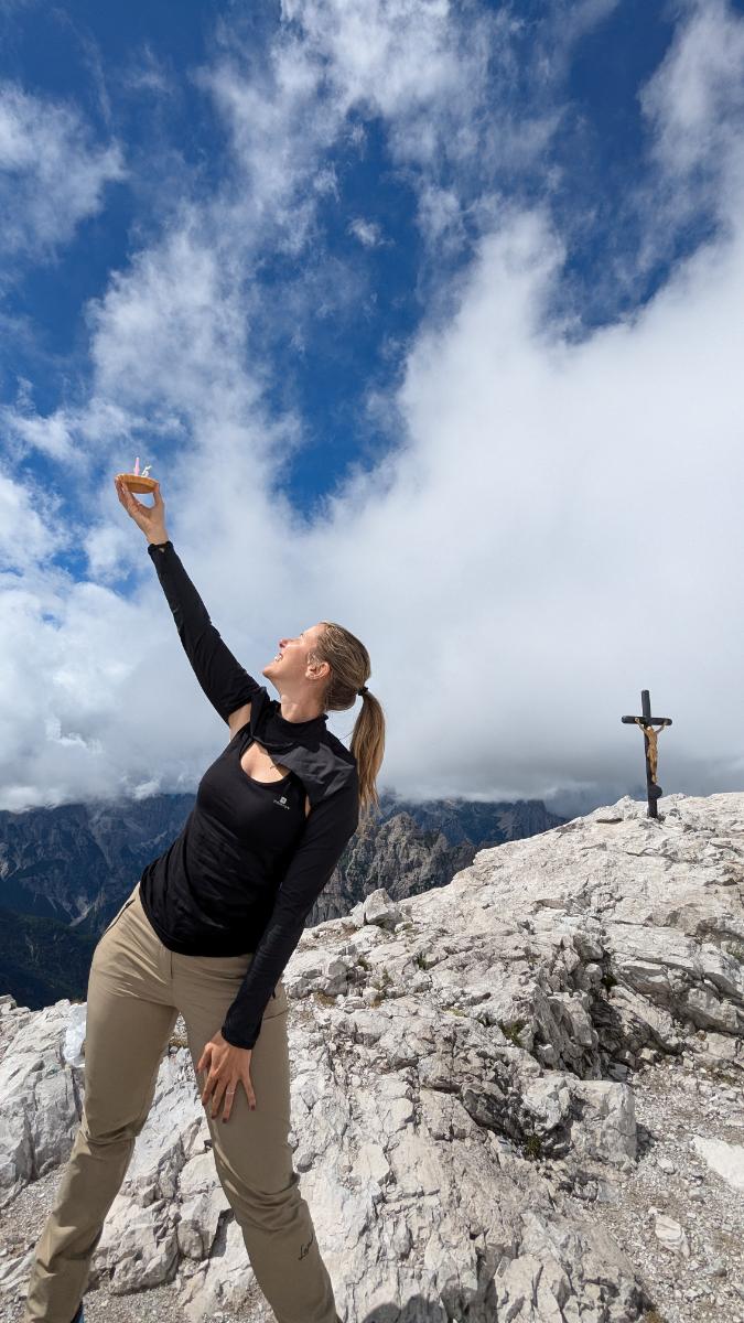 Sulla cima è presente una piccola croce con un Cristo dorato. Timidi fiori gialli spuntano tra le rocce, e noi festeggiamo il compleanno di Silvia.