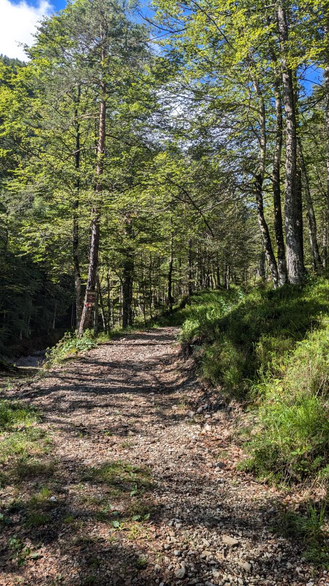 Dai Laghetti di Forni (870 mslm), grazioso parco “urbano” alle porte del paese – tre specchi d’acqua riflettono le fronde dei pini sulla loro superficie quieta – saliamo su sentiero (indicazioni) fino a incrociare la strada asfaltata in località Davost; pieghiamo sulla sinistra e iniziamo una super morbida salita lungo il versante del Cimacuta, percorrendo un tratto dell’Anello di Forni. Arriviamo così attorno ai mille metri di quota in località Palas (1025 mslm), dove termina la strada asfaltata e si allarga – per modo di dire, perché è piuttosto piccolo – il parcheggio di servizio del Rifugio Pacherini. È anche il punto in cui arriva il sentiero 362 da Andrazza.