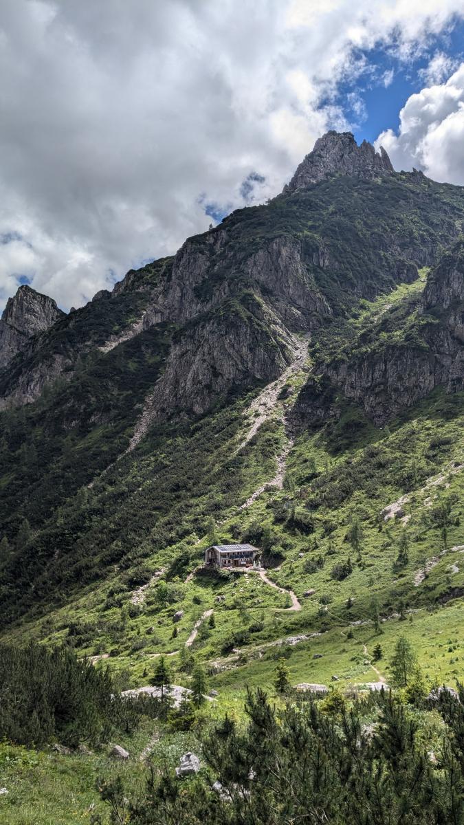 Il rifugio si trova alle pendici di Cima Suola, su un terrazzo presso il quale scorre un ruscello. La sua sagoma in larice, la fresca fontana, le fioriture esuberanti tutto attorno – sono il pezzo forte di questa valle, e in genere di tutte le Dolomiti Friulane – un caffè preso per guadagnare slancio dopo la salita: arrivare al Pacherini è un piacere!