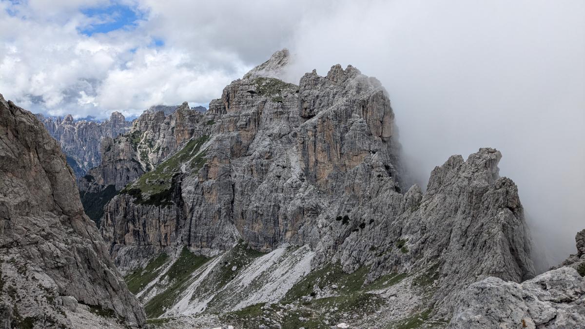 Il nostro panorama è monco, in quanto per metà occupato dalle nuvole in rapido movimento. Eppure, gli sprazzi sono eccezionali: dalle montagne friulane al mare, dai Tauri alle friulana, alle Pale di San Martino, e poi Marmolada, Civetta, Pelmo, e ancora Monfalconi, Tre Cime di Lavaredo, Cridola; ovviamente, la Carnia, le valli di Claut.