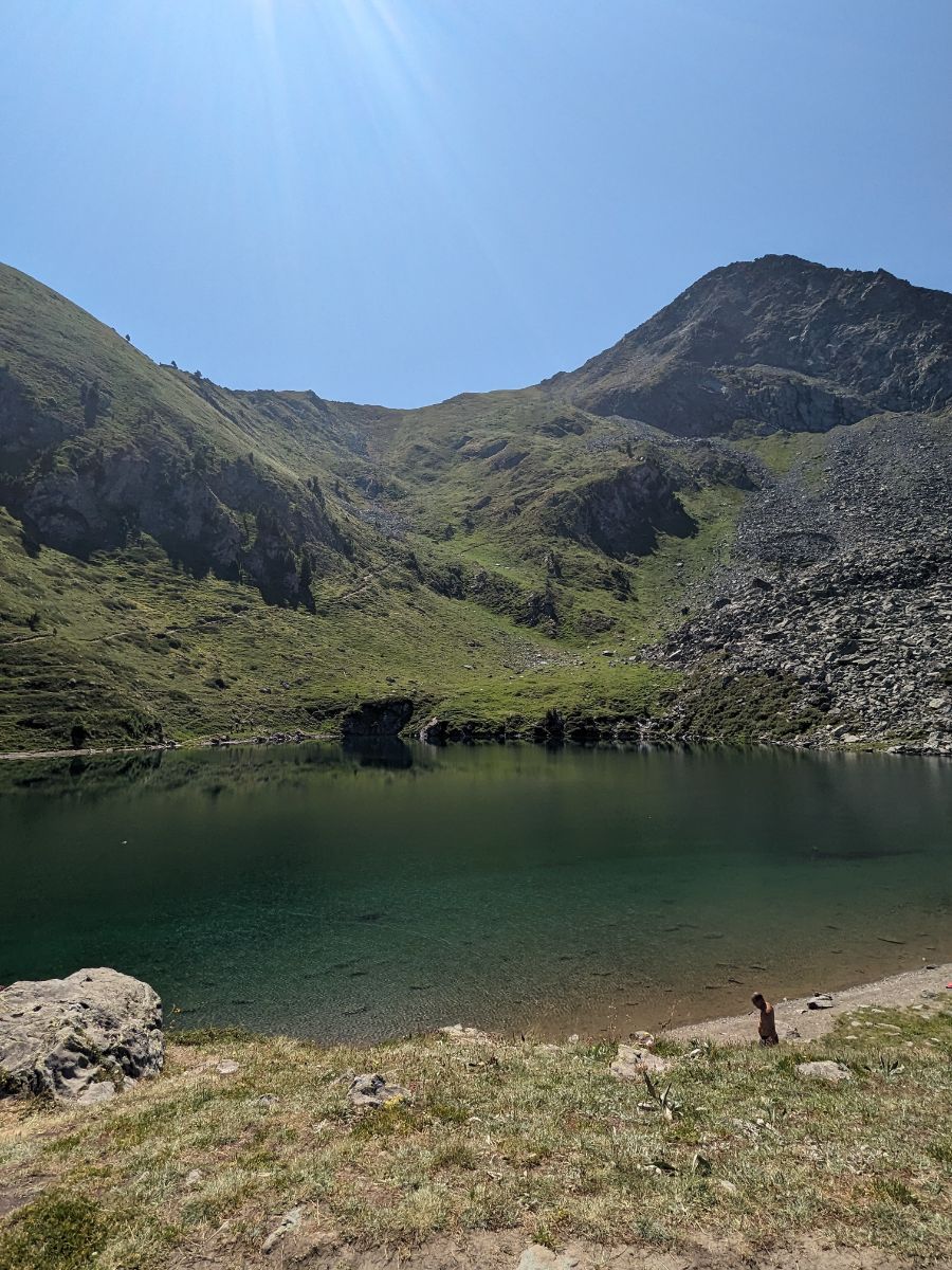 Il Lago di Chamolé invita a fermarsi, c’è poco da fare, non ultimo per la visuale che dalla riva nord si ha verso le montagne di sinistra della Valle Centrale. Ma se non vuoi trovarti nella folla – l’arrivo della seggiovia si trova a cinque minuti in piano da qui – ti consiglio di proseguire per il Col de Chamolé: il sentiero 102 ora lo vedi salire, in diagonale, sul verde versante oltre il lago.