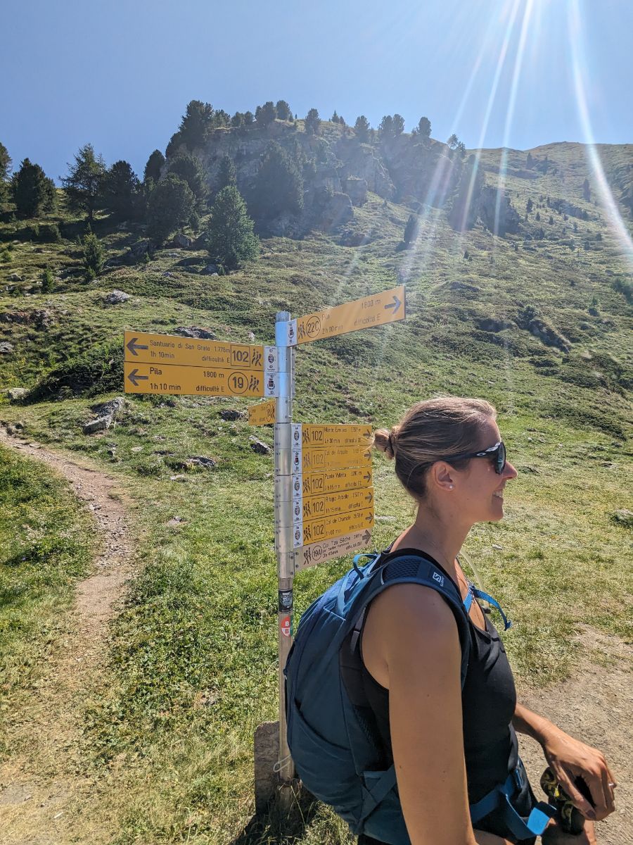 Dal parcheggio, sali le scalette (le trovi in corrispondenza della fontana) che, attraversata la strada, conducono all’Ufficio Turistico di Pila e all’arrivo della telecabina da Aosta. Da qui, prendi a sud – trovi le indicazioni per il Rifugio Arbolle – e sali sulla sterrata che costeggia i vari alberghi, ristoranti e seggiovie e baby park e solarium eccetera fino ad avere sulla sinistra il Bike Planet. Prosegui sulla forestale (trovi un’infilata di cartelli di legno), fai il tornante sulla sinistra e… uff! sei infine fuori da Pila!