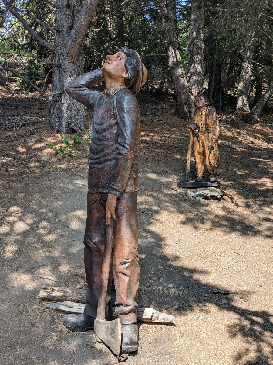 Più di 200 sculture di legno dipinto, disposte ovunque lungo il sentiero 13. Stambecchi e cervi, scoiattoli e vipere, civette e lepri, ma anche cinghiali, leoni, scimmie. Aquile, certo. Api giganti e mucche al pascolo. E persone, tantissime persone, intente nel loro modo di vivere la montagna: boscaioli, preti, pastorelli… amanti in preda alla foga e persino un escursionista intento a fare la pupù.